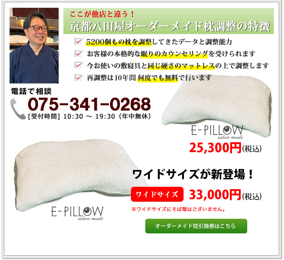 当店でもオーダーメイド枕をお作りしているのですが、上記のポイントを非常に重要視して調整を行っています。というのも最近、他店でオーダーメイド枕を作ったけれども持ち帰って使ってみると合わないと言った事でご相談に来られるお客様が増えてきたのがその理由です。枕作りは単に体に合わせて作るのではなくお客様の睡眠環境に合わせて作ることが求められているのですが、そういったお店が一体どの程度あるのでしょうか・・・。